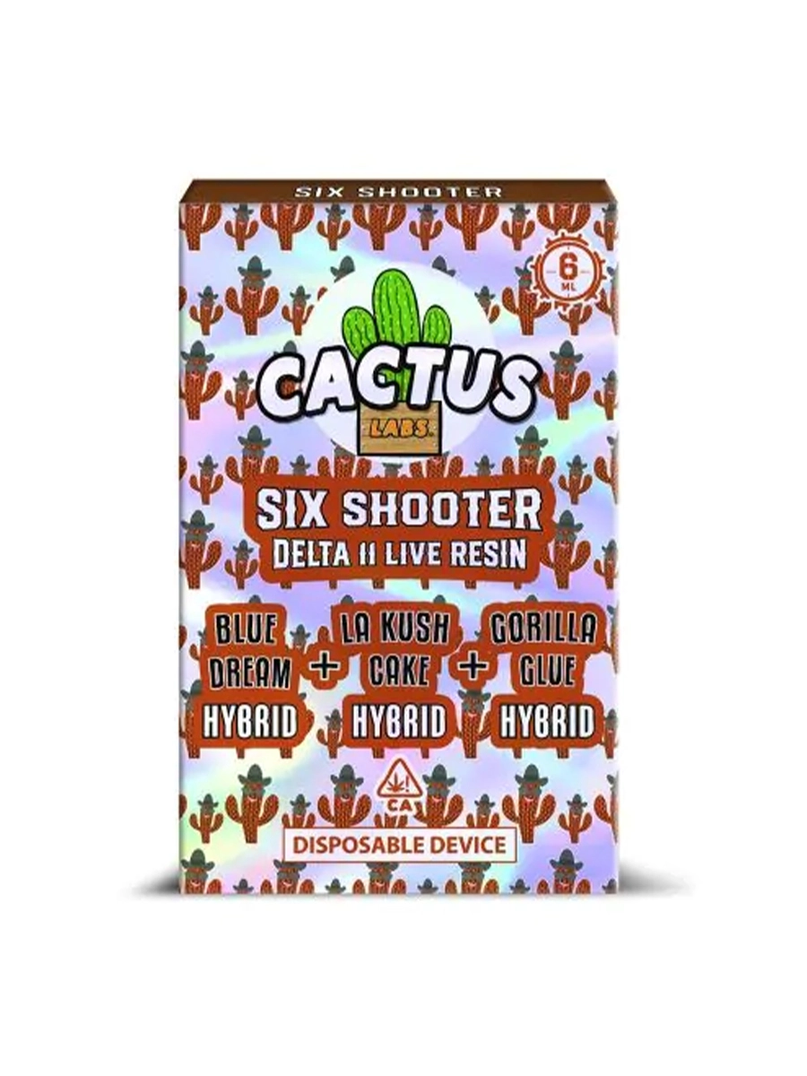 Introducing the Blue Dream | LA Kush Cake | Gorilla Glue Cactus Labs Six Shooter D11 Live Resin Disposable featuring Blue Dream, LA Kush Cake, and Gorilla Glue strains. This vaping device is the ultimate choice for users who want to enjoy the unique flavors and effects of different strains in one convenient device.