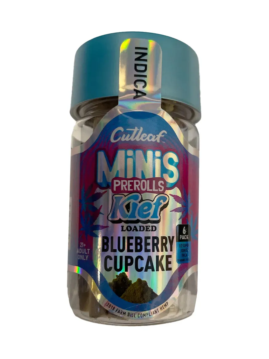 Delight your senses with the sweet and fruity essence of Blueberry Cupcake Cutleaf MiNiS Jars Kief Pre-Roll 3G, a perfect choice for a flavorful and potent experience.