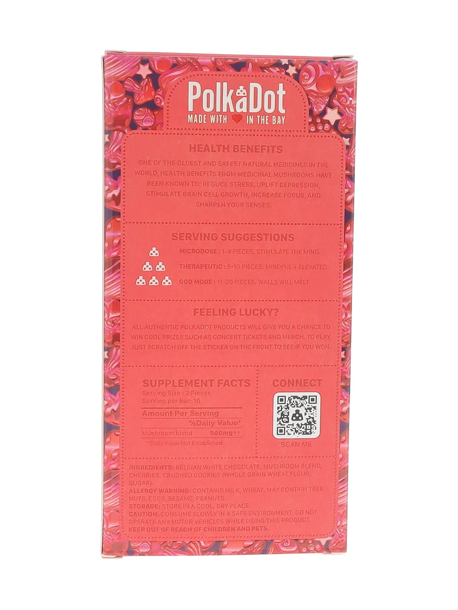 Indulge in the exquisite taste of Cherry Groove PolkaDot Magic Mushroom Belgian Milk Chocolate. This premium chocolate bar combines smooth, creamy Belgian milk chocolate with a cherry-infused filling, creating a delightful fusion of flavors and textures. Each piece is thoughtfully infused with 250mg of Amanita Muscaria extract, ensuring a controlled and enjoyable experience.