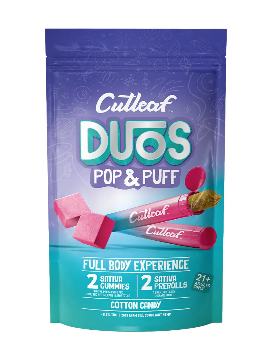 Satisfy your sweet tooth with Cotton Candy Cutleaf Duos Pop & Puff THCA Pre-Rolls & Gummies 2ct, a fun and flavorful way to enjoy hemp-derived cannabinoids in both smoke and gummy form.