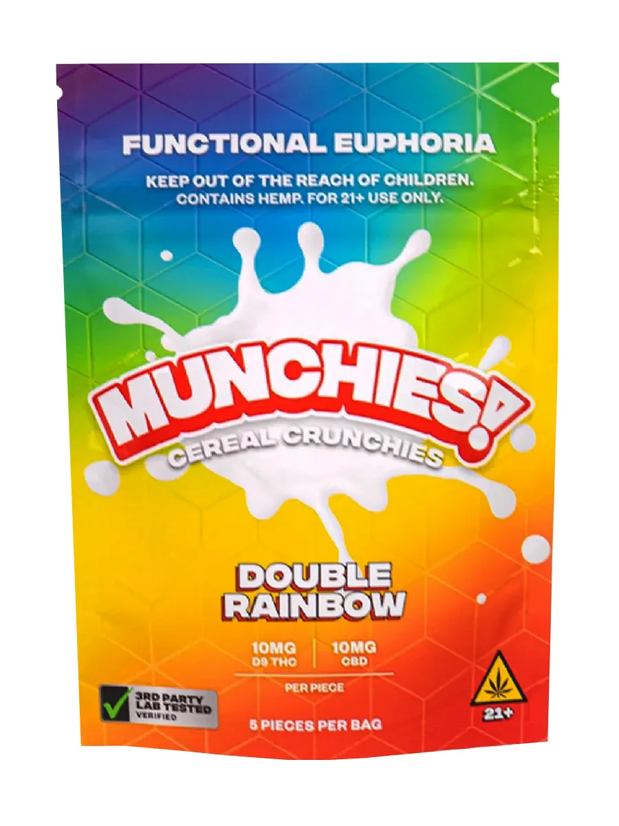 Double Rainbow Crunchies Munchies bring sweet, colorful cereal flavor mixed with a smooth blend of Delta 9 and CBD. Each piece is crunchy, gooey, and packed with a balanced effect that feels steady and pleasant.