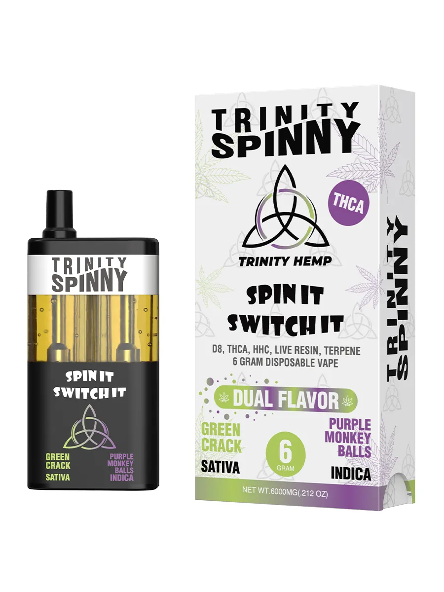 The Green Crack & Purple Monkey Balls Trinity Spinny 6G D8/THCA/Live Resin Dual Flavor Vape offers a dynamic vaping experience by combining two distinct strains in one device. This dual-flavor vape allows users to switch between the invigorating effects of Green Crack and the relaxing sensations of Purple Monkey Balls, all infused with a blend of Delta-8 THC, THCA, and live resin for enhanced potency and flavor.
