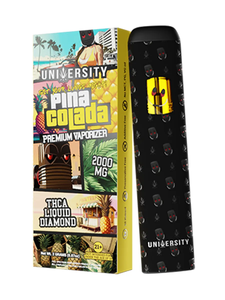 Pina Colada University THCA Liquid Diamond Disposable 2G offers a taste of the tropics with its blend of pineapple and coconut flavors. This disposable vape, enhanced with THCA Liquid Diamonds, delivers a sweet, creamy experience that’s reminiscent of a classic piña colada cocktail. Each puff provides a smooth, flavorful hit, ideal for those who enjoy a fruity, dessert-like vaping experience in a convenient, disposable format.